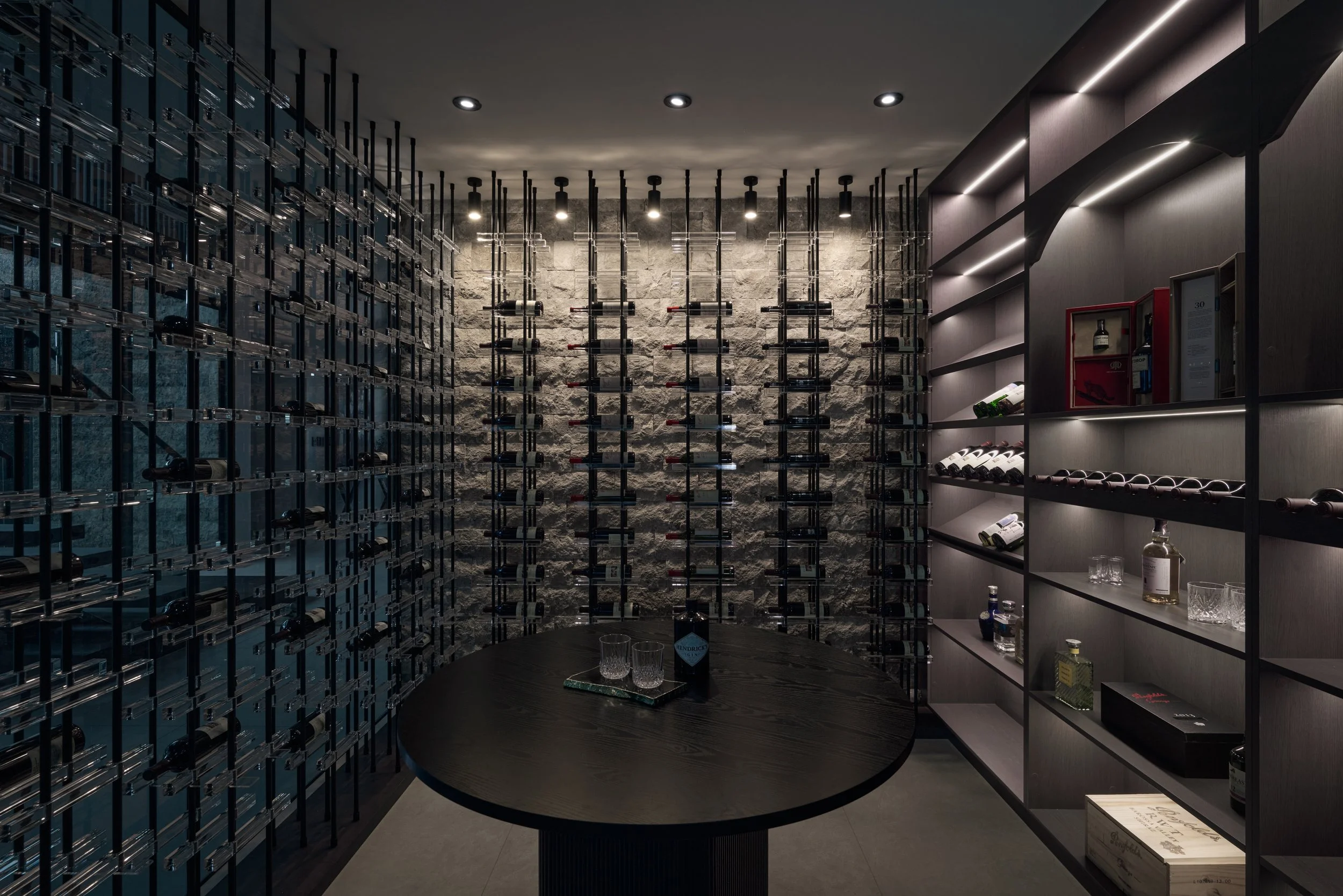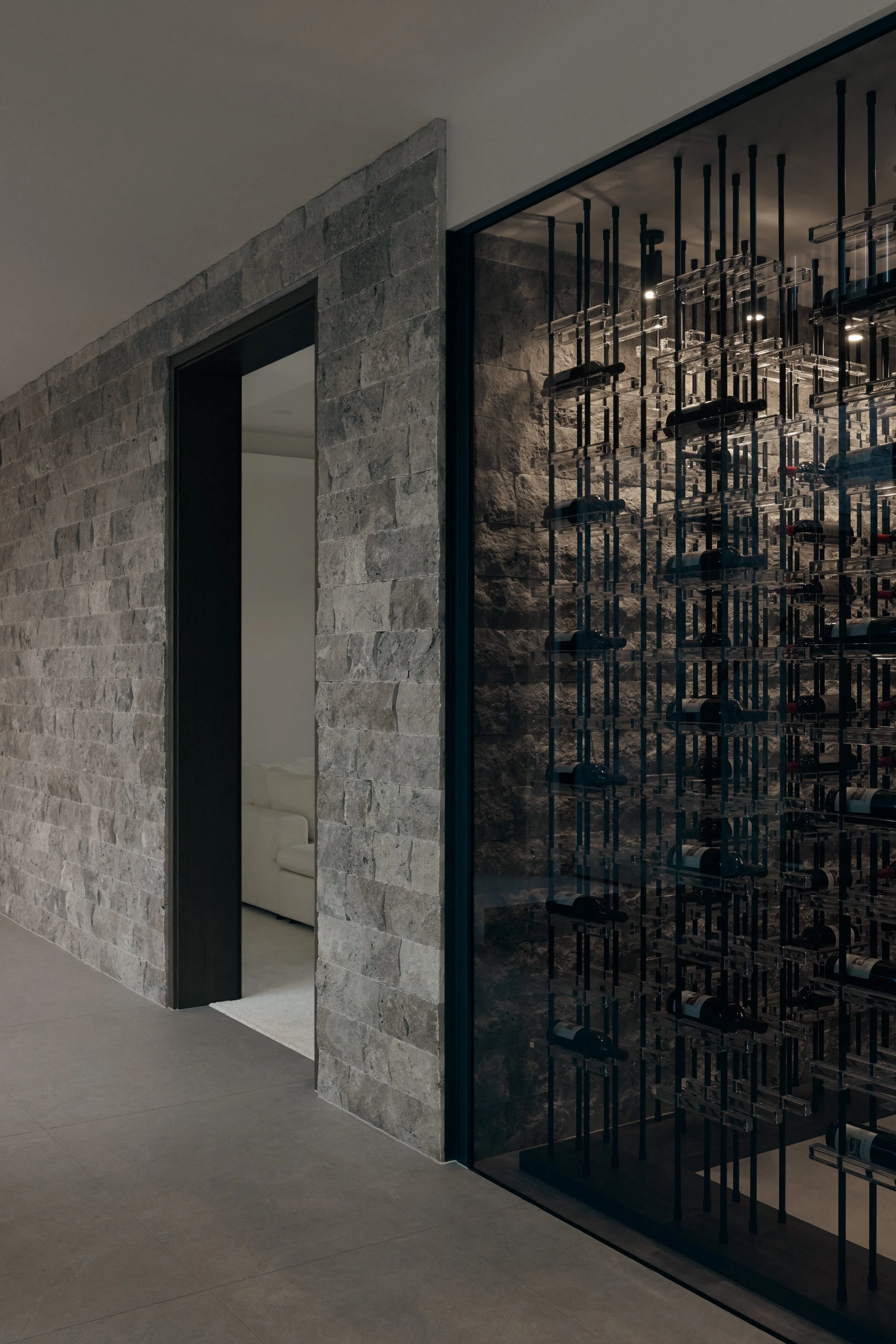 Movement through the home is slow and deliberate, unfolding as a series of quiet transitions. Arrival is understated, a sheltered entry wrapped in natural stone, where texture, shadow, and silence set the tone. The exterior is fully clad in stone, grounding the house in the landscape and allowing it to sit with permanence rather than presence.