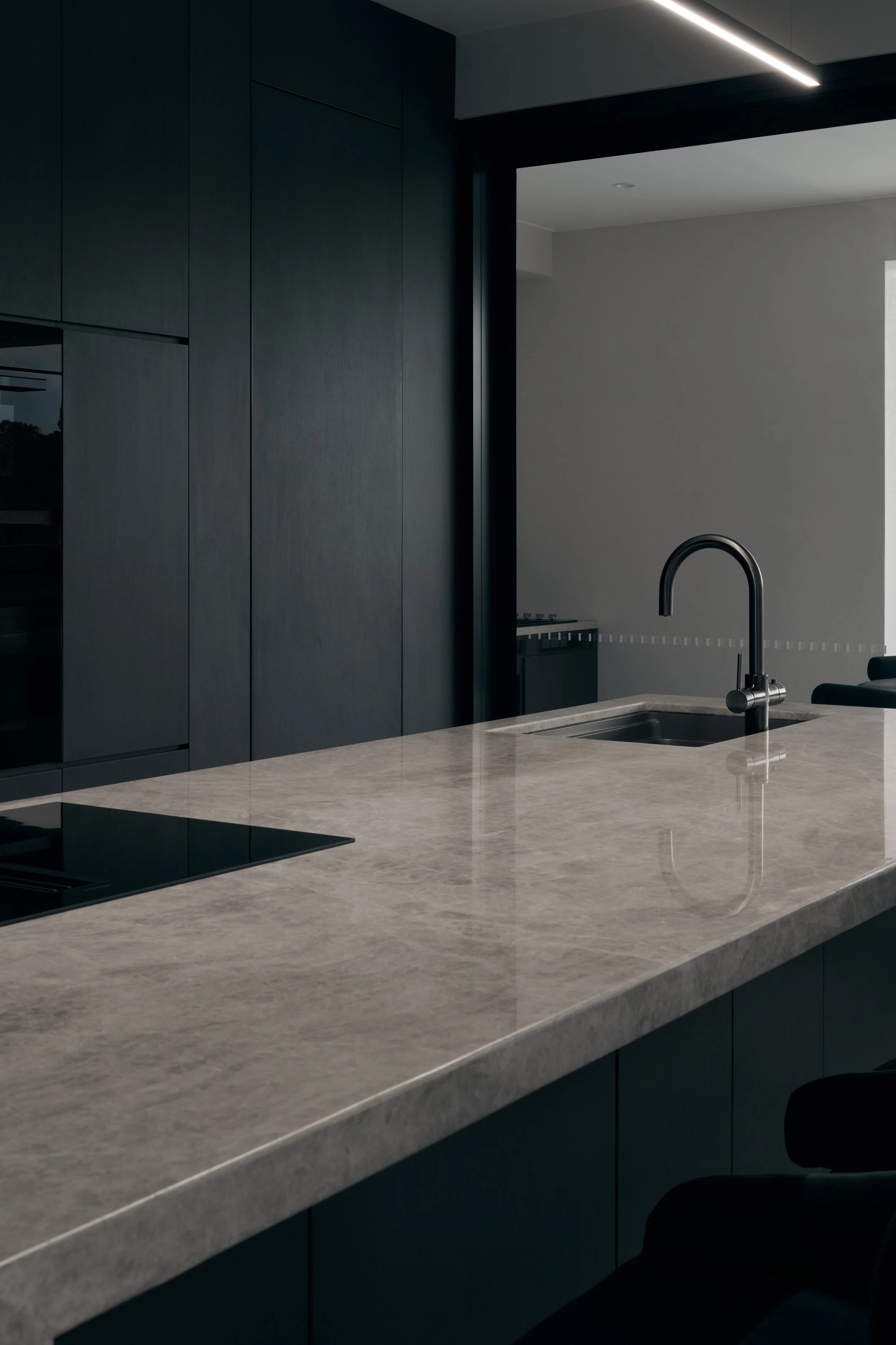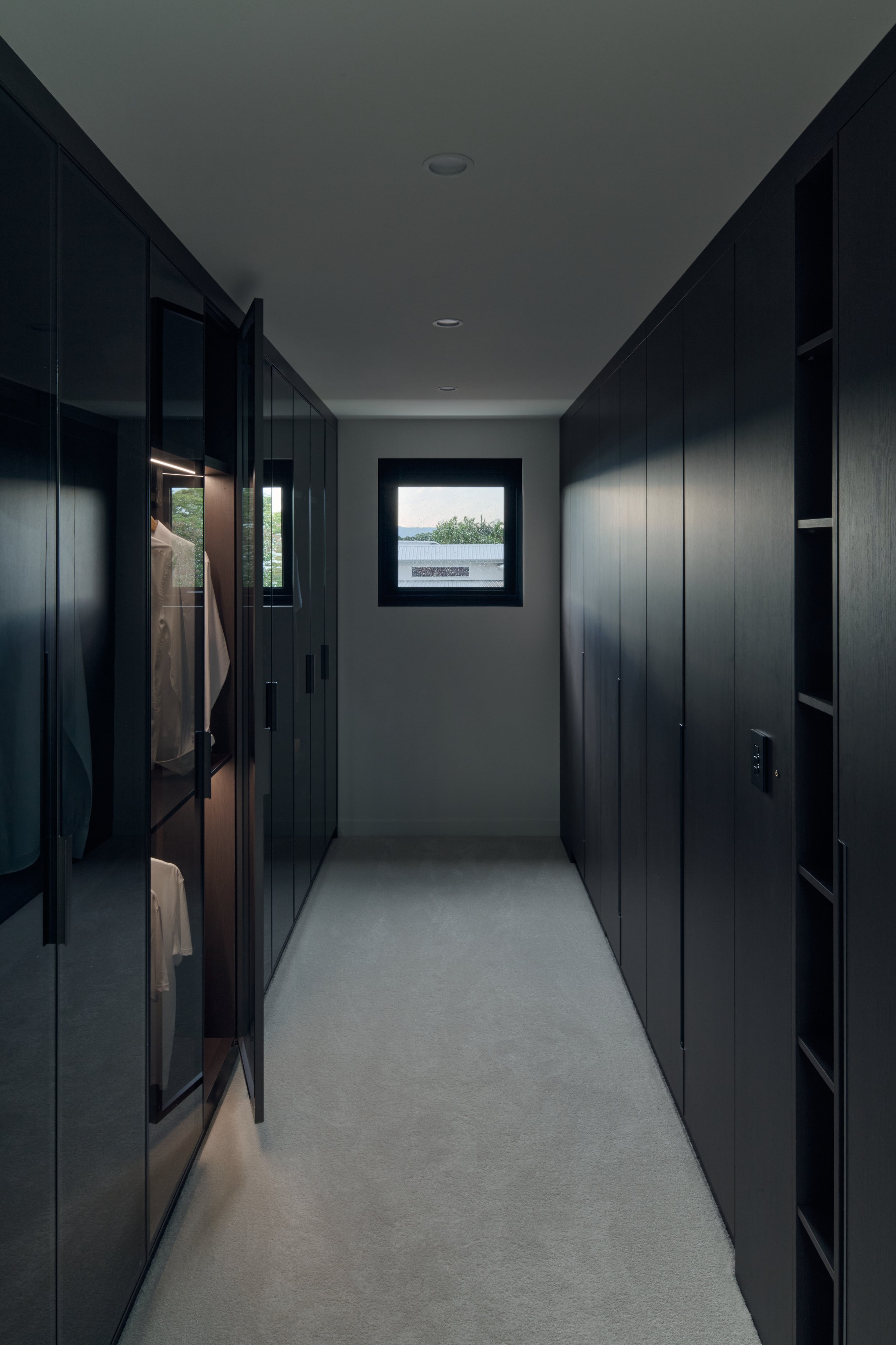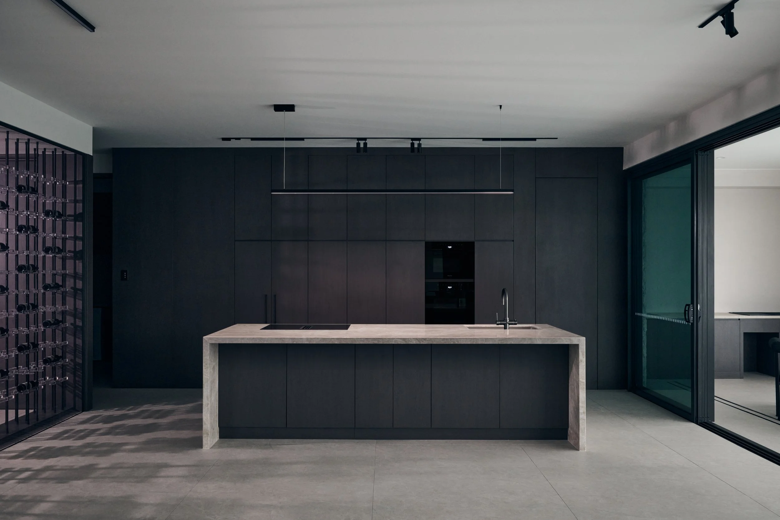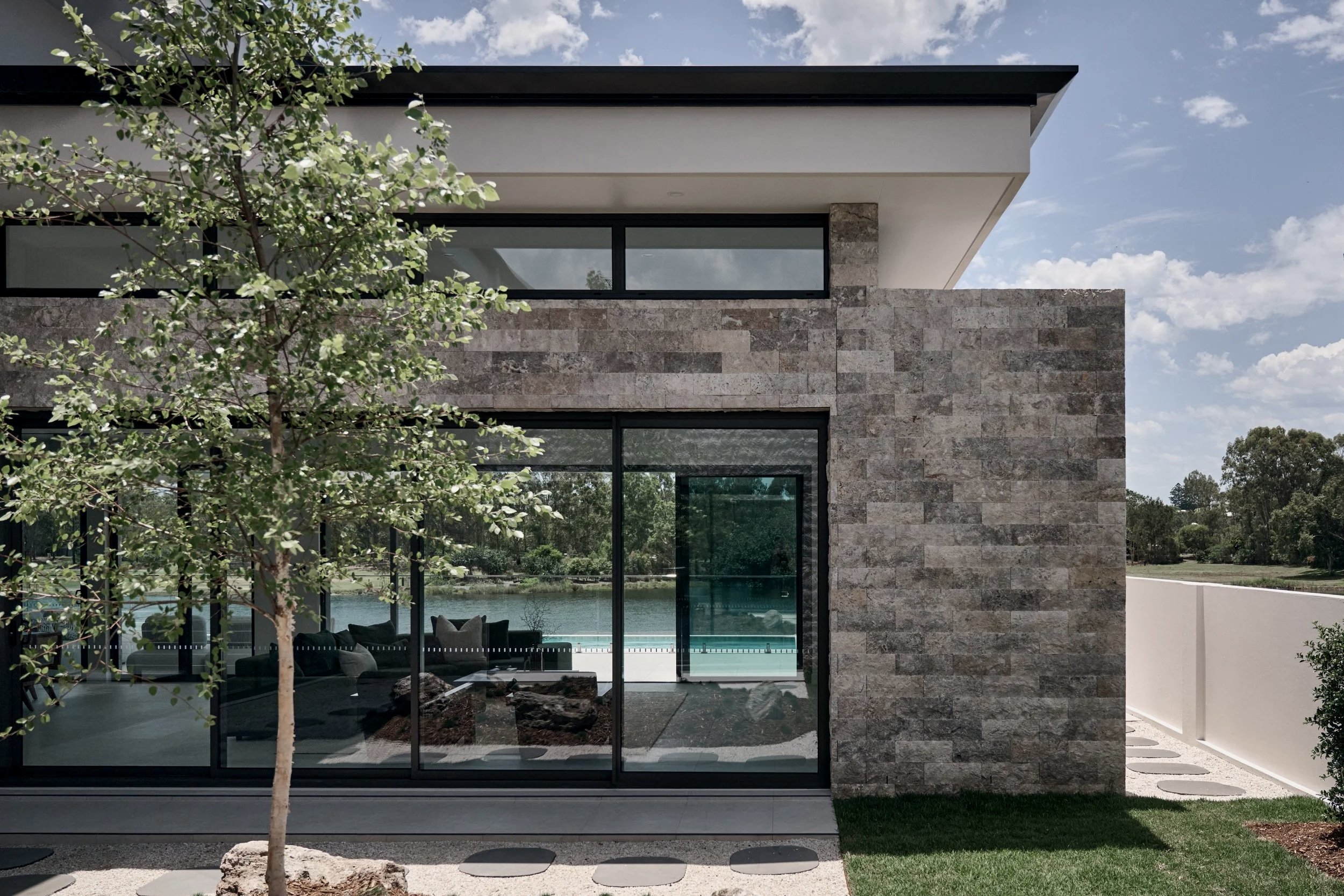 As you move inward, dark, finely crafted joinery frames each threshold, guiding circulation without announcing it. Living spaces open gradually to the lake and Botanic Gardens beyond, where expansive glazing draws water, greenery, and sky into the interior. Taj Mahal stone anchors the home’s core, its soft veining and warm undertones bringing lightness to contrast the depth of timber and shadow.