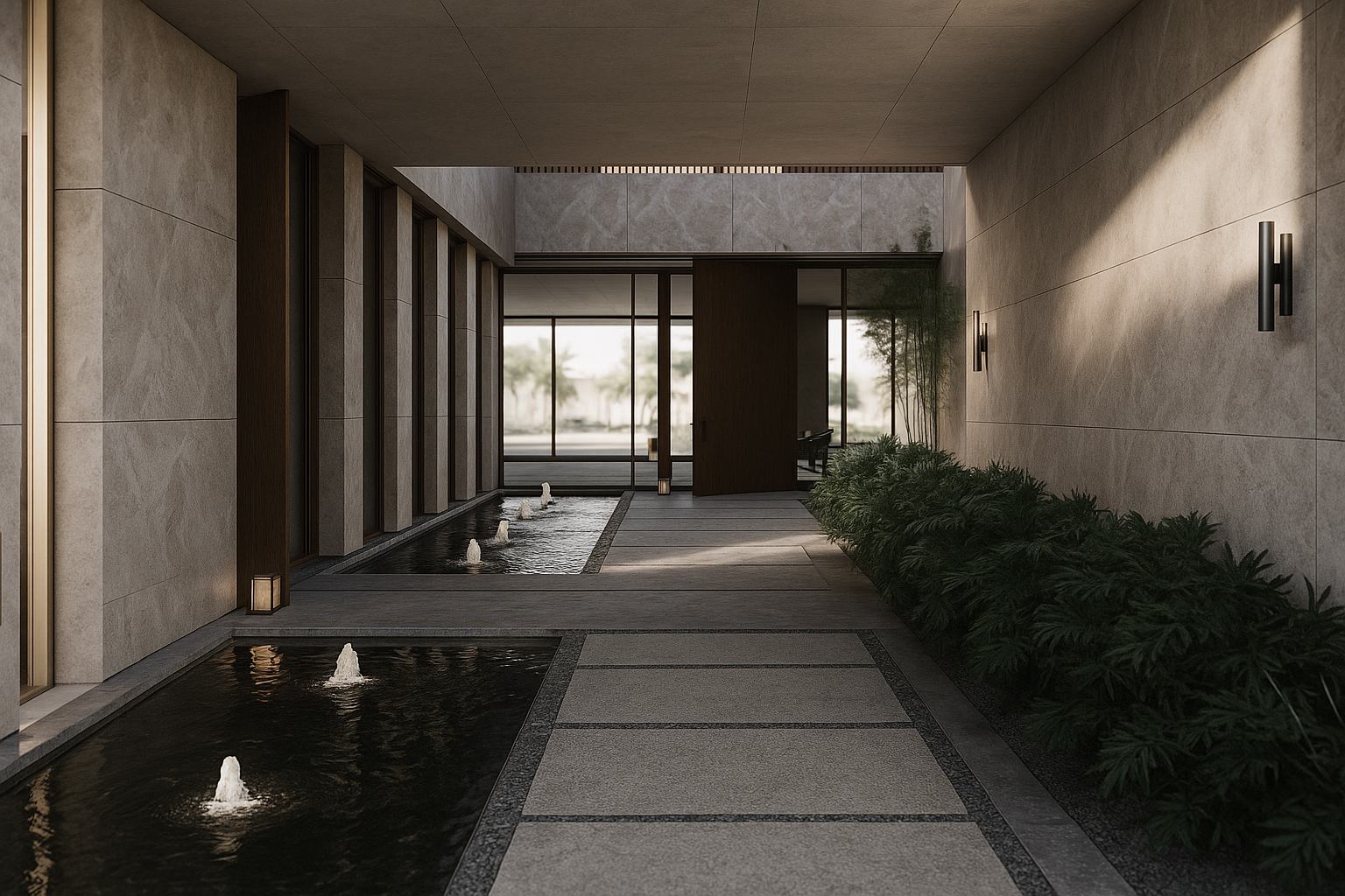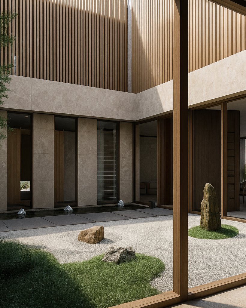 By incorporating open layouts, precise lines, and durable materials such as timber and stone, these designs establish a structural yet seamless connection to the natural environment.