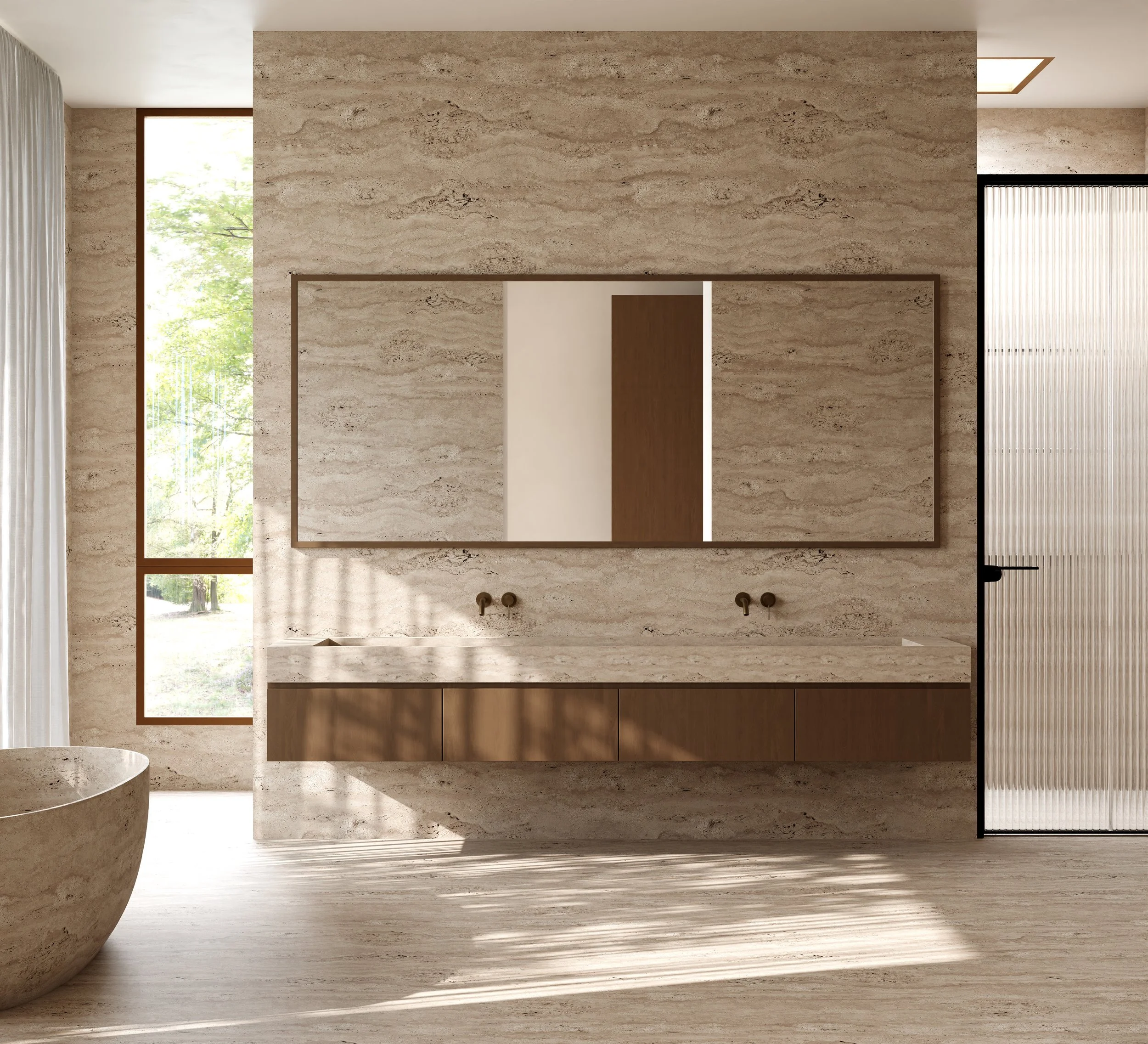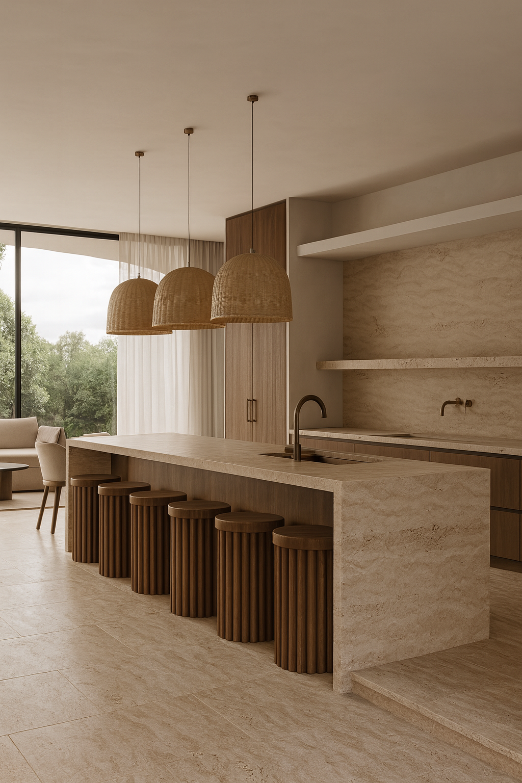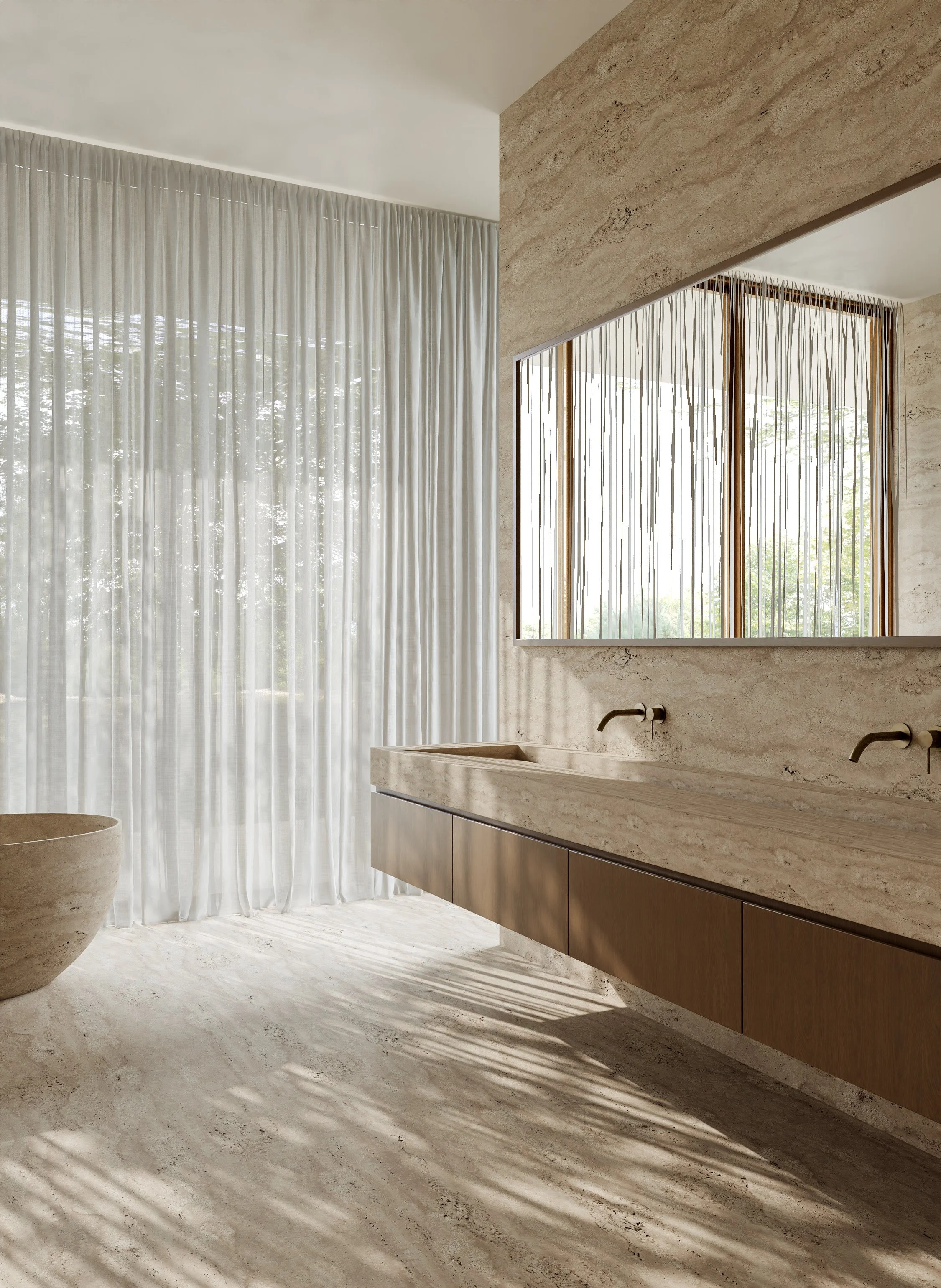 A carefully considered and restrained palette of natural stone and timber defines the home's clean, robust but warm character.